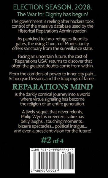 Election Season, 2028. The War for Dignity has begun! The government is reeling after hackers took control of the massive database used by the Historical Reparations Administration. As panicked techno-refugees flood its gates, the rising Church of Modestianity offers sanctuary from the surveillance state. Facing an uncertain future, the cast of "Reparations USA" returns to discover that often the greatest doubts come from within. From the corridors of power to inner city pain... Schoolyard lessons to the trappings of fame... "Reparations Mind" is the darkly comical journey into a world where virtue signaling has become the religion of an entire generation. A lively sequel that never relents, Philip Wyeth's irreverent satire has belly laughs... touching moments... bizarre spectacles... political intrigue... and even a prescient vision for the future! This is Book Two of the "Reparations" series. 59,000 words.