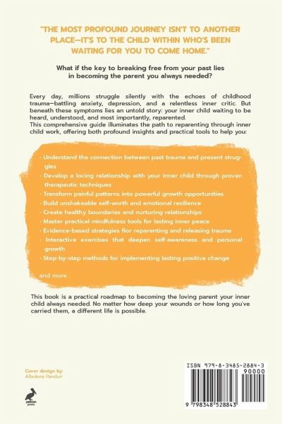 "Reparenting Your Inner Child: A Journey to Wholeness" is a transformative guide that illuminates the link between past trauma and present healing. Drawing from personal experience and psychological insights, this book offers readers a comprehensive approach to understanding and nurturing their inner child-that fundamental part of the psyche that holds both our capacity for joy and our deepest wounds. The book begins by establishing a strong foundation for healing, explaining how our childhood experiences shape our adult behaviors, relationships, and decision-making patterns. It explores the science behind self-sabotaging behaviors and the profound connection between emotional and physical well-being. Through practical exercises, personal anecdotes, and actionable strategies, readers learn to: * Identify and understand their inner child's influence on their adult life * Break free from self-destructive patterns and negative self-talk * Transform unconscious reactions into conscious responses * Heal the mind-body connection through holistic approaches * Develop healthier relationships with themselves and others This guide is especially valuable for those struggling with self-sabotage, negative patterns, or unresolved childhood experiences. It provides a compassionate, step-by-step approach to healing that combines psychological insights with practical applications, leading readers toward lasting emotional wellness and inner peace.