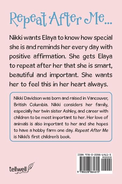 Nikki Davidson was born and raised in Vancouver, British Columbia. Nikki considers her family and career with children to be most important to her. Her love of animals is also important to her and she hopes to have a hobby farm one day. Repeat After Me is Nikki's first children's book.