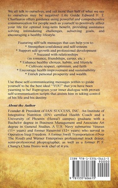 We all talk to ourselves, and yet more than half of what we say to ourselves may be negative! Life Guide Edward F. T. Charfauros offers guidance using powerful and comprehensive communication for people such as yourself to positively affect your life for optimal long-term benefit. Featuring self-talk messages that can help you to: Strengthen confidence and self-esteem; Support self-growth and professional development; Succeed with relationships (romance, friendships, career, etc.); Enhance healthy choices, habits, and lifestyle; Cultivate respect, optimism, and faith; Encourage health improvement and sustainability, and Enrich personal prosperity and wealth. Use these self-communicating messages within and guide yourself to be the best ideal "YOU" that you have been yearning to be! Reprogram your inner dialogue with Edward F. T. Charfauros' proven self-communication scripts that assists him in taking control of his life and his destiny.