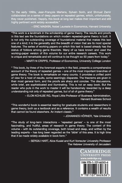 Three leading experts have produced a landmark work based on a set of working papers published by the Center for Operations Research and Econometrics (CORE) at the Université Catholique de Louvain in 1994 under the title 'Repeated Games', which holds almost mythic status among game theorists. Jean-François Mertens, Sylvain Sorin and Shmuel Zamir have significantly elevated the clarity and depth of presentation with many results presented at a level of generality that goes far beyond the original papers - many written by the authors themselves. Numerous results are new, and many classic results and examples are not to be found elsewhere. Most remain state of the art in the literature. This book is full of challenging and important problems that are set up as exercises, with detailed hints provided for their solutions. A new bibliography traces the development of the core concepts up to the present day.