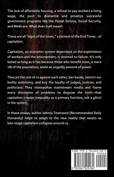 The lack of affordable housing, a refusal to pay workers a living wage, the push to dismantle and privatize successful government programs like the Postal Service, Social Security, and Medicare. What does it all mean?These are all "signs of the times," a portent of the End Times...of capitalism.Capitalism, an economic system dependent on the exploitation of workers and the environment, is doomed to failure. It's only lasted as long as it has because those who benefit most, a mere 1% of the population, wield an ungodly amount of power.They pit the rest of us against each other, ban books, restrict our bodily autonomy, and buy the loyalty of judges, justices, and politicians. They monopolize mainstream media and frame every discussion of problems to disguise the truth-that capitalism creates inequality as a primary function, not a glitch in the system. In these essays, author Johnny Townsend (Recommended Daily Humanity) helps us adapt to the new reality that awaits as late-stage capitalism collapses around us.