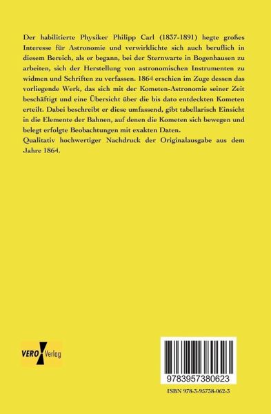 Der habilitierte Physiker Philipp Carl (1837-1891) hegte großes Interesse für Astronomie und verwirklichte sich auch beruflich in diesem Bereich, als er begann, bei der Sternwarte in Bogenhausen zu arbeiten, sich der Herstellung von astronomischen Instrumenten zu widmen und Schriften zu verfassen. 1864 erschien im Zuge dessen das vorliegende Werk, das sich mit der Kometen-Astronomie seiner Zeit beschäftigt und eine Übersicht über die bis dato entdeckten Kometen erteilt. Dabei beschreibt er diese umfassend, gibt tabellarisch Einsicht in die Elemente der Bahnen, auf denen die Kometen sich bewegen und belegt erfolgte Beobachtungen mit exakten Daten.