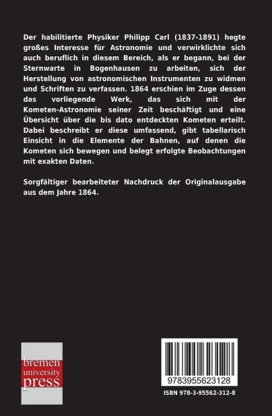 Der habilitierte Physiker Philipp Carl (1837-1891) hegte großes Interesse für Astronomie und verwirklichte sich auch beruflich in diesem Bereich, als er begann, bei der Sternwarte in Bogenhausen zu arbeiten, sich der Herstellung von astronomischen Instrumenten zu widmen und Schriften zu verfassen. 1864 erschien im Zuge dessen das vorliegende Werk, das sich mit der Kometen-Astronomie seiner Zeit beschäftigt und eine Übersicht über die bis dato entdeckten Kometen erteilt. Dabei beschreibt er diese umfassend, gibt tabellarisch Einsicht in die Elemente der Bahnen, auf denen die Kometen sich bewegen und belegt erfolgte Beobachtungen mit exakten Daten.