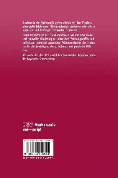 Ais Pflichtveranstaltung fOr viele Studierende verschiedener Fachrichtungen kommt jeweils dem ersten Semester einer Vorlesungsreihe Ober Funktionentheorie eine besonders groBe Bedeutung zu. Deshalb setzten wir uns zum Ziel, die m6glichen Inhalte einer solchen einfOhrenden Veranstaltung zu einem Repetitorium zusammenzufassen, thematisch zu gliedern und anhand ausfOhrliche bearbeiteter PrOfungsaufgaben zu erlautern. Dem Studierenden soli mit diesem Repetitorium die Einordnung und das Erlernen des Vorlesungsstoffes erleichtert werden. Die zahlreichen bearbeiteten Aufgaben sollen das Verstandnis der Theorie vertiefen, sowie eine Hilfe sein beim L6sen von Obungsaufgaben und bei der Vorbereitung auf die Semester klausuren. Bei der Auswahl des Inhalts berOcksichtigten wir auch diejenigen Themen, die in einer einsemestrigen EinfOhrungsvorlesung oft nur am Rande oder erst im zweiten Semester behandelt werden kbnnen, deren Wichtigkeit aber eine Aufnahme in dieses Repetitorium rechtfertigt. Beispiele hierzu sind die konformen Abbildungen, die harmonischen Funktionen, die Indexfunktion, die Homologieversionen der Integralsatze, die Riemannsche Zahlensphare, der Holomorphiebegriff im unendlich fernen Punkt sowie die Si:itze von Mittag-Leffler und WeierstraB. Jeder Paragraph gliedert sich in einen Theorie- und einen Aufgabenteil. Der erste Abschnitt faBt die wichtigsten Definitionen und Aussagen zusammen, die zum Lbsen der Aufgaben des zweiten Teils benbtigt werden.