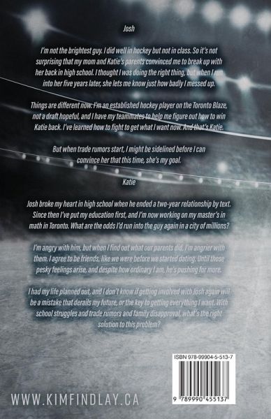I'll do anything to get her back. Josh I'm not the brightest guy. I did well in hockey but not in class. So it's not surprising that my mom and Katie's parents convinced me to break up with her back in high school. I thought I was doing the right thing, but when I run into her five years later, she lets me know just how badly I messed up. Things are different now. I'm an established hockey player on the Toronto Blaze, not a draft hopeful, and I have my teammates to help me figure out how to win Katie back. I've learned how to fight to get what I want now. And that's Katie. But when trade rumors start, I might be sidelined before I can convince her that this time, she's my goal. Katie Josh broke my heart in high school when he ended a two-year relationship by text. Since then I've put my education first, and I'm now working on my master's in math in Toronto. What are the odds I'd run into the guy again in a city of millions? I'm angry with him, but when I find out what our parents did, I'm angrier with them. I agree to be friends, like we were before we started dating. Until those pesky feelings arise, and despite how ordinary I am, he's pushing for more. I had my life planned out, and I don't know if getting involved with Josh again will be a mistake that derails my future, or the key to getting everything I want. With school struggles and trade rumors and family disapproval, what's the right solution to this problem?
