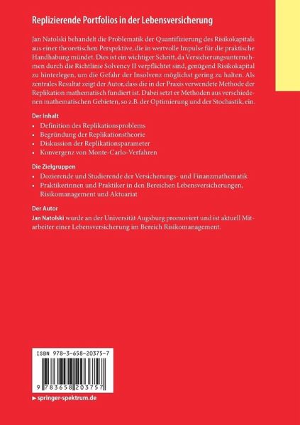 Jan Natolski behandelt die Problematik der Quantifizierung des Risikokapitals aus einer theoretischen Perspektive, die in wertvolle Impulse für die praktische Handhabung mündet. Dies ist ein wichtiger Schritt, da Versicherungsunternehmen durch die Richtlinie Solvency II verpflichtet sind, genügend Risikokapital zu hinterlegen, um die Gefahr der Insolvenz möglichst gering zu halten. Als zentrales Resultat zeigt der Autor, dass die in der Praxis verwendete Methode der Replikation mathematisch fundiert ist. Dabei setzt er Methoden aus verschiedenen mathematischen Gebieten, so z.B. der Optimierung und der Stochastik, ein.