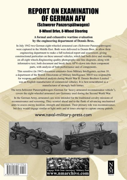A formal and exhaustive wartime evaluation by the engineering department of Dennis Bros. In July 1942 two German eight-wheeled armoured cars (Schwerer Panzerspähwagen) were captured in the Middle East. Both were delivered to Dennis Bros. to allow their engineering department to make a full technical report and assessment, giving constructional particulars on these unusual vehicles, which had both drive and steering on all eight wheels.Engineering quality photography and line diagrams, along with informative text, both document and break these AFVs down into their component parts, with analysis of both performance and of components. This sensitive (in 1942) document emanates from Military Intelligence, section 10, a department of the British Directorate of Military Intelligence. MI10 was responsible for weapons and technical analysis during World War II. Dennis Brothers Limited was an English manufacturer of commercial vehicles. It is best remembered as a manufacturer of strongly built lorries. The term Schwerer Panzerspähwagen (German for 'heavy armoured reconnaissance vehicle'), covers the eight-wheeled armoured cars Germany used during the Second World War. In the German Army, armoured cars were intended for the traditional cavalry missions of reconnaissance and screening. They scouted ahead and to the flank of advancing mechanised units to assess enemy location, strength and intention. Their primary role was reconnaissance, but they would engage similar or light units and at times attempt to capture enemy patrols.