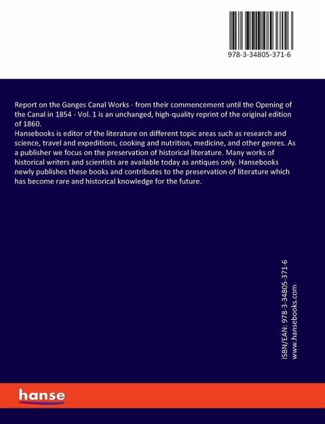 Report on the Ganges Canal Works - from their commencement until the Opening of the Canal in 1854 - Vol. 1 is an unchanged, high-quality reprint of the original edition of 1860.Hansebooks is editor of the literature on different topic areas such as research and science, travel and expeditions, cooking and nutrition, medicine, and other genres. As a publisher we focus on the preservation of historical literature. Many works of historical writers and scientists are available today as antiques only. Hansebooks newly publishes these books and contributes to the preservation of literature which has become rare and historical knowledge for the future.