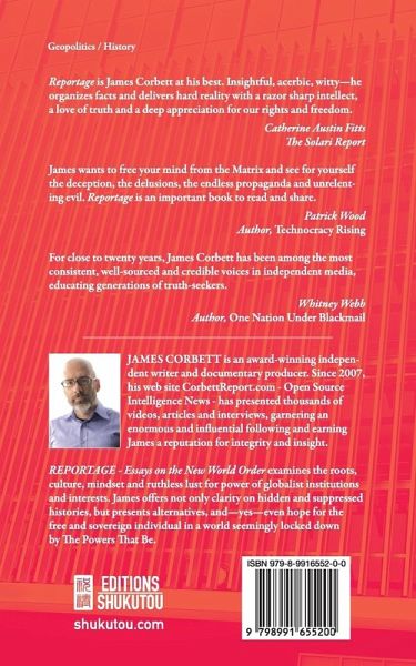 REPORTAGE - Essays on the New World Order examines the roots, culture, mindset and insatiable and ruthless lust for power of globalist institutions and interests. James offers not only clarity on the Who, What, How and Why of hidden and suppressed histories, but also presents alternatives, and-yes-even hope for the free and sovereign individual in a world seemingly locked down by The Powers that Be. JAMES CORBETT is an award-winning independent writer and documentary producer. Since 2007, his web site CorbettReport.com - Open Source Intelligence News has presented thousands of videos, articles and interviews, garnering an enormous and influential following and earning James a reputation for integrity and insight.