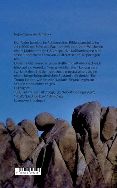Reportagen aus AmerikaDer Autor bereiste im Rahmen eines Bildungsprojekts im Jahr 2000 mit Sohn und Partnerin während zehn Wochen in einem Mobilhome die USA respektive Kalifornien und hielt seine Eindrücke in Form von 27 literarischen "Reportagen" fest. Dieser leicht ironische, unverstellte und oft überraschende Blick auf ein Amerika, "wie es wirklich war", kontrastiert stark mit dem Bild der heutigen, tief gespaltenen, bürgerkriegsähnlichen Ex-Trump-Nation, wie die vier "Update"-Ergänzungen am Schluss eindrücklich zeigen.Highlights: "Big Tree","Baseball", "Jogging", "Arbeitsbedingun-gen", "Post", "Election Day", "Bingo" u.a.Lesenswert!