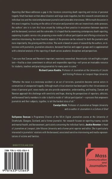 Reporting Bad News addresses a gap in the literature concerning death reporting and stories of personal tragedy. Much has been written about disasters and large-scale tragedies, but this research concentrates on individual loss and the relationship between journalist and vulnerable interviewee. While much discussion in this area is negative, focusing on the ethics of intrusion and journalists who act insensitively under pressure, the authors' aim is to turn this focus around by looking at best practice in encounters between reporters and the bereaved, survivors and the vulnerable. It is hoped that by examining contemporary death reporting, explaining its public service role, proposing a new model of ethical participation and offering a structure for sensitive interviewing, the most harmful aspects of the process can be reduced for both the journalist and, more importantly, the grieving and the victims. The work is based on years of research by the authors, on interviews with journalists, journalism educators, bereaved families and support groups and is supplemented with a detailed analysis of the reporting of death across academic disciplines and perspectives.
