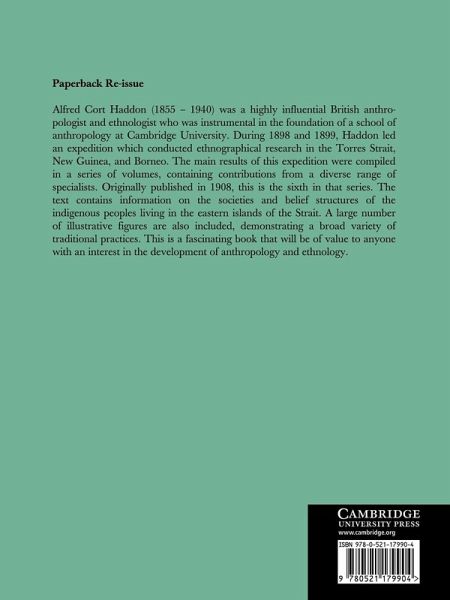 Alfred Cort Haddon (1855-1940) was a highly influential British anthropologist and ethnologist who was instrumental in the foundation of a school of anthropology at Cambridge University. During 1898 and 1899, Haddon led an expedition which conducted ethnographical research in the Torres Strait, New Guinea, and Borneo. The main results of this expedition were compiled in a series of volumes, containing contributions from a diverse range of specialists. Originally published in 1908, this is the sixth in that series. The text contains information on the societies and belief structures of the indigenous peoples living in the eastern islands of the Strait. A large number of illustrative figures are also included, demonstrating a broad variety of traditional practices. This is a fascinating book that will be of value to anyone with an interest in the development of anthropology and ethnology.