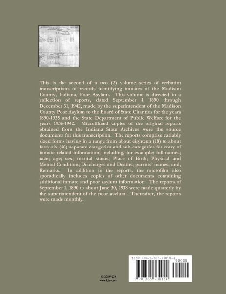 This is the second of a two (2) volume series of verbatim transcriptions of records identifying inmates of the Madison County, Indiana, Poor Asylum. This volume is directed to a collection of reports, dated September 1, 1890 through December 31, 1942, made by the superintendent of the Madison County Poor Asylum to the Board of State Charities for the years 1890-1935 and the State Department of Public Welfare for the years 1936-1942. The reports comprise variably sized forms having in a range from about eighteen (18) to about forty-six (46) separate categories and sub-categories for entry of inmate related information, including, for example: full names; race; age; sex; marital status; Place of Birth; Physical and Mental Condition; Discharges and Deaths; parents' names; and, Remarks.
