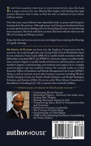 If getting married this year is your expectation, then this book is a major resource for you. Marital bliss begins with finding the right partner. Discover what it takes to find the wife or husband of your dream without sweats. Over the years, many believers have depended solely on prayer and fasting for locating their life partners. Although prayer and fasting are fundamental keys in many spiritual issues, finding and to be found depend more on repositioning than on prayers. This book will show you how. This book will also show you the 9Rs of Locating and Being Located. Enjoy the ride and see you soon in your own happy home enjoying the blessings of a godly marriage.