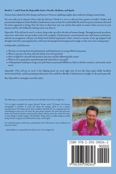 Book 6, 7, and 8 from the Repossible Series: Decide, Meditate, and Spark. Dreams been dashed by life's bumps and bruises? Discover uplifting insights that could turn things around today. Do you wake up in despair? Does each day lack joy? Stuck in a rut or a job you have grown to loathe? Author and personal development leader Bradley Charbonneau came to hate his comfortable life until one precise moment rebooted his entire approach to living. Now he's here to share how you can reclaim that spark no matter where you are in your journey and live the brilliantly shining vision you deserve. Repossible: Who will you be next? is a short, sharp wake-up call to the idea of instant change. Through personal anecdotes, interviews with other success-seekers, and vivid examples, Charbonneau's conversational tone with honest and humor-infused encouragement will put you firmly back behind inspiration's wheel. Aimed at anyone of any age plagued with thoughts that life is passing them by, you'll soon feel pumped and invigorated enough to take your next exciting steps! In Repossible, you'll discover:The keys to moving from disenchantment and hopelessness to energy-filled momentum Ways to tap into your best self and unlock your true potential How to high-five yourself with positive direction and life-affirming daily action What to do to guarantee intentional growth and achieve your goals A blueprinted roadmap to forge your path back to personal fulfillment, links to further resources, and much, much more! Repossible: Who will you be next? is the helping hand you need right now. If you like deep topics deftly handled, motivational kicks, and fist-pumping enthusiasm, then you'll love Bradley Charbonneau's straight-to-the-point pep talk. Buy Repossible to reimagine your life today!