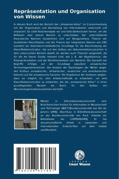 In diesem Buch wird der Bereich der "Amazonas-Kultur" im Zusammenhang mit der Organisation und Darstellung von Informationen untersucht und analysiert. Es stellt Kulturkonzepte vor und hebt Denkschulen hervor, um die Reflexion über diesen Bereich zu unterstützen. Der unterstützende theoretische Rahmen konzentriert sich auf Ranganathans Theorie der facettierten Klassifikation und die Theorie der integrativen Ebenen von CRG (London) als theoretisch-methodische Grundlage für die Beschreibung der Klassifikationsstruktur, die auf den Aufbau von Dokumentationssprachen in dem untersuchten Bereich abzielt. Es werden auch Theorien vorgestellt, die für die Art dieser Studie relevant sind, wie z. B. der Kognitivismus, die Polyrepräsentation und die Domänenanalyse von Hjorland. Die Auswahl der Begriffe erfolgte auf der Grundlage populärer amazonischer Terminologiewörterbücher. Die Analyse der Etymologien der Wörter zeigte den Einfluss europäischer, afrikanischer, asiatischer und amerikanischer Kulturen auf die amazonische Sprache. Die Ergebnisse der Analysen zeigten, dass es möglich ist, eine Arbeitsmethodik zu entwickeln, um eine Klassifikationsstruktur zu entwerfen, die die "amazonische Kultur" in ihren grundlegenden Wurzeln als Basis für den Aufbau von Wissensorganisationssystemen darstellt.