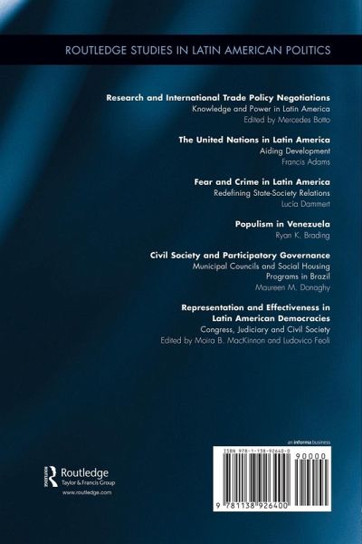 PART I Introduction. The Representativeness - Effectiveness Dilemma; Moira MacKinnon and Ludovico Feoli PART II. 1. Reflections on the Effectiveness and Representativeness of the Chilean Congress; Eduardo Alemán 2. Argentina's Unrepresentative and Unaccountable Congress Under the Kirchners; Mark P. Jones and Juan Pablo Micozzi 3. Effectiveness and Representation: Effects on Federal Deputies' Career Choice and Reelection; Lucio Renno and Carlos Pererira 4. Representation and Decision Making in the Mexican Congress; Maria Amparo Casar 5. Congress in Action: Representativeness and Effectiveness in Chile and Argentina (1900-1930); Moira MacKinnon PART III. 6. Effectiveness and Accessibility of Justice System Institutions in Mexico's Transition to Democracy; Julio Ríos Figueroa 7. The Role of Chile's Constitutional Court in the Consolidation of Democracy (1990-2011); Javier Couso 8. Courting from the Left: Judicial Effectiveness and Representativeness in the Brazilian State of Acre; Matthew C. Ingram 9. Judiciary and Democracy in Argentina; Daniel Alberto Sabsay PART IV. 10. Meanings and Challenges of Representativeness in Brazilian Civil Society; Evelina Dagnino 11. Reflections on the 'Representativeness' of Civil Society Organizations: An Analysis of Recent Latin American trends; Enrique Peruzzotti 12. Democratic Institutions and Public Effectiveness of Chilean Civil Society in the Post Nineties; Gonzalo Delamaza PART V: Conclusion.
