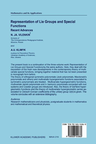 In 1991-1993 our three-volume book "Representation of Lie Groups and Spe cial Functions" was published. When we started to write that book (in 1983), editors of "Kluwer Academic Publishers" expressed their wish for the book to be of encyclopaedic type on the subject. Interrelations between representations of Lie groups and special functions are very wide. This width can be explained by existence of different types of Lie groups and by richness of the theory of their rep resentations. This is why the book, mentioned above, spread to three big volumes. Influence of representations of Lie groups…mehr