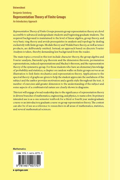 From the reviews: "Steinberg ... provides a one-semester course on representation theory with just linear algebra and a beginning course in abstract algebra (primarily group theory) as prerequisites. ... the author covers most of the standard introductory topics in representation theory. The exercises provide more examples and further common results. It is the applications that Steinberg uses to motivate the subject that make this text both interesting and valuable. ... Overall, a very user-friendly text with many examples and copious details. Summing Up: Recommended. Upper-division undergraduates through researchers/faculty." (J. T. Zerger, Choice, Vol. 49 (11), August, 2012) "The book consists of 157 pages spread over 11 chapters. ... This book is an introductory course and it could be used by mathematicians and students who would like to learn quickly about the representation theory and character theory of finite groups, and for non-algebraists, statisticians and physicists who use representation theory." (Jamshid Moori, Mathematical Reviews, Issue 2012 j) "The required background as to this introductory course on group representations, is in the level of linear algebra, group theory and some ring theory. ... the book under review is a welcome one for students at an advanced undergraduate or introductory graduate level course, also for those people like physicists, statisticians and non-algebraically oriented mathematicians who need representation theory in their work." (R. W. van der Waall, Zentralblatt MATH, Vol. 1243, 2012) "The author has, by combining clear writing with an accessible and minimal-prerequisite approach to group representations, created a book that may well help bring group representation theory into the undergraduate curriculum. This is an impressive and useful text, and should be looked at by anybody with an interest in the subject." (Mark Hunacek, The Mathematical Association of America, February, 2012)