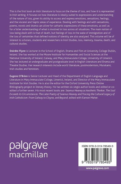 This is the first book on Irish literature to focus on the theme of loss, and how it is represented in Irish writing. It focuses on how literature is ideally suited to expressions and understanding of the nature of loss, given its ability to access and express emotions, sensations, feelings, and the visceral and haptic areas of experience. Dealing with feelings and with sensations, poems, novels and drama can allow for cathartic expressions of these emotions, as well as for a fuller understanding of what is involved in loss across all situations. The main notion of loss being dealt with is that of death, but feelings of loss in the wake of immigration and of the loss of certainties that defined notions of identity are also analysed. This volume will be of interest to scholars, students and researchers in Irish Studies, loss, memory, trauma, death, and cultural studies.