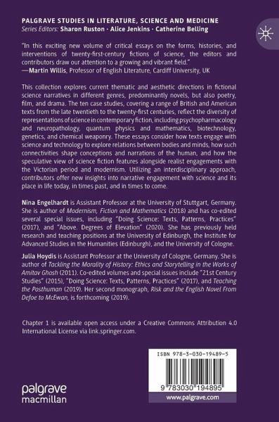 This collection of essays explores current thematic and aesthetic directions in fictional science narratives in different genres, predominantly novels, but also poetry, film, and drama. The ten case studies, covering a range of British and American texts from the late twentieth to the twenty-first centuries, reflect the diversity of representations of science in contemporary fiction, including psychopharmacology and neuropathology, quantum physics and mathematics, biotechnology, genetics, and chemical weaponry. This collection considers how texts engage with science and technology to explore relations between bodies and minds, how such connectivities shape conceptions and narrations of the human, and how the speculative view of science fiction features alongside realist engagements with the Victorian period and modernism. Utilizing an interdisciplinary approach, contributors offer new insights into narrative engagement with science and its place in life today, in times past, and intimes to come.