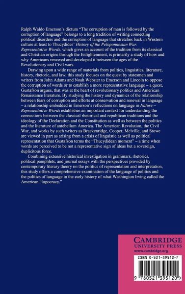 Ralph Waldo Emerson's dictum - 'The corruption of man is followed by the corruption of language' - belongs to a long tradition of writing connecting political disorders and the corruption of language that stretches back in Western culture. Representative Words, which gives an account of the tradition from its classical and Christian origins through the Enlightenment, is primarily a study of how and why Americans renewed and developed it between the ages of the Revolutionary and the Civil Wars. It is the first comprehensive treatment of the background to and the appearance of the wealth of theories about language in the early era of American political and cultural discourse. Professor Gustafson's argument demonstrates the interconnectedness of the state of language and the state of society and turns on the question of representation and misrepresentation - whether and how words represent or misrepresent nature, social reality, truth, and value in the new American experiment in representative republican government.