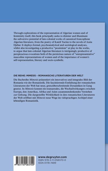 This monograph explores the ways in which canonical Francophone Algerian authors, writing in the late-colonial period (1945-1962), namely Kateb Yacine, Mohammed Dib, Mouloud Feraoun, Mouloud Mammeri and Assia Djebar, approached the representation of Algerian women through literature. The book initially argues that a masculine domination of public fields of representation in Algeria contributed to a postcolonial marginalization of women as public agents. However, it crucially also argues that the canonical writers of the period, who were mostly male, both textually acknowledged their inability to articulate the experiences and subjectivity of the feminine Other and deployed a remarkable variety of formal and conceptual innovations in producing evocations of Algerian femininity that subvert the structural imbalance of masculine symbolic hegemony. Though it does not shy from investigating those aspects of its corpus that produce ideologically conditioned masculinist representations,the book chiefly seeks to articulate a shared reluctance concerning representativity, a pessimism regarding the revolution's capacity to deliver change for women, and an omnipresent subversion of masculine subjectivity in its canonical texts.