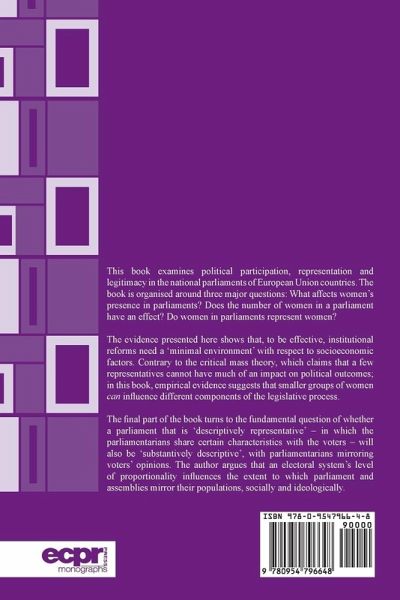 This work discusses questions on political participation, representation and legitimacy in the European Union national parliaments. Three major empirical questions structure the book: What affects women's presence in parliaments?, Does the number of women in parliament have an effect? And are women in parliament representing women? Empirical evidences show that institutional reforms need a 'minimal environment' in terms of socio-economic development so as to prove effective. As opposed to the critical mass theory, claiming that a few representatives cannot have an impact on the political outcomes, here the empirical evidences suggest that smaller groups can also influence the different components of the legislative process. The last part turns to the fundamental question of whether a parliament that is descriptively representative, i.e. in which the parliamentarians share certain characteristics with the voters, also is a substantively descriptive parliament, i.e. in which the parliamentarians mirror the voters' opinions.