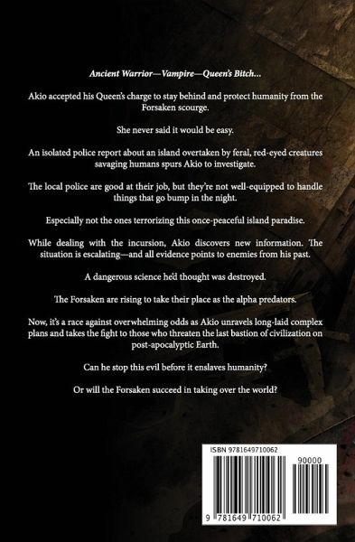Ancient Warrior-Vampire-Queen's Bitch... Akio accepted his Queen's charge to stay behind and protect humanity from the Forsaken scourge. She never said it would be easy. An isolated police report about an island overtaken by feral, red-eyed creatures savaging humans spurs Akio to investigate. The local police are good at their job, but they're not well-equipped to handle things that go bump in the night. Especially not the ones terrorizing this once-peaceful island paradise. While dealing with the incursion, Akio discovers new information. The situation is escalating-and all evidence points to enemies from his past. A dangerous science he'd thought was destroyed. The Forsaken are rising to take their place as the alpha predators. Now, it's a race against overwhelming odds as Akio unravels long-laid complex plans and takes the fight to those who threaten the last bastion of civilization on post-apocalyptic Earth. Can he stop this evil before it enslaves humanity? Or will the Forsaken succeed in taking over the world? Go up and click 'READ FOR FREE' or 'BUY NOW' and find out if Akio, Yuko and Eve accomplish this task for their Queen, or die trying.