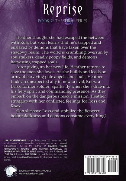 Heather thought she had escaped the Between with Ross but soon learns he's trapped and enslaved by demons that have taken over the shadowy realm. The world is crumbling, overrun by soulstalkers, deadly poppy fields, and demons harvesting trapped souls. . After giving up her new life, Heather returns to save her love. As she builds and leads an army of surviving pale angels and souls, she finds an unexpected ally in Knox, a fierce former soldier. Sparks fly when she's drawn to his fiery spirit and commanding presence. As they embark on the dangerous rescue mission, Heather struggles against her conflicted feelings for Ross and Knox. Can she save Ross and stabilize the Between before darkness consumes everything? Reprise is the second book in a heart-pumping, action-packed urban fantasy series, The Spiral that will leave you on the edge of your seat.