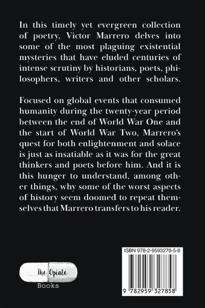 In this timely yet evergreen collection of poetry, Victor Marrero delves into some of the most plaguing existential mysteries that have eluded centuries of intense scrutiny by historians, poets, philosophers, writers and other scholars. Focused on global events that consumed humanity during the twenty-year period between the end of World War One and the start of World War Two, Marrero's quest for both enlightenment and solace is just as insatiable as it was for the great thinkers and poets before him. And it is this hunger to understand, among other things, why some of the worst aspects of history seem doomed to repeat themselves that Marrero transfers to his reader.