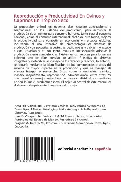 Arnoldo González R., Profesor Emérito, Universidad Autónoma de Tamaulipas, México, Fisiología y Endocrinología de la Reproducción, Sistemas, Rumiantes,José F. Vázquez A., Profesor, UAEM-Temascaltepec, Universidad Autónoma del Estado de México, Reproducción Animal, Froylán A. Lucero M., Profesor, Universidad Autónoma de Tamaulipas, Zootecnia.
