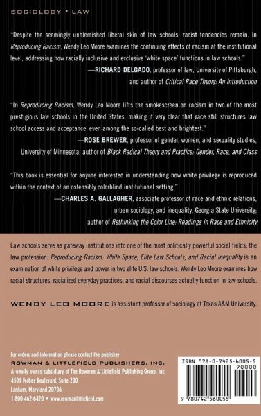 Law schools serve as gateway institutions into one of the most politically powerful social fields: the profession of law. Reproducing Racism is an examination of white privilege and power in two elite United States law schools. Moore examines how racial structures, racialized everyday practices, and racial discourses function in law schools. Utilizing an ethnographic lens, Moore explores the historical construction of elite law schools as institutions that reinforce white privilege and therefore naturalize white political, social, and economic power.