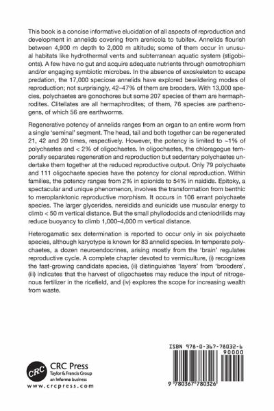 This book is a concise informative elucidation of all aspects of reproduction and development in annelids covering from arenicola to tubifex. Annelids flourish between 4,900 m depth to 2,000 m altitude; some of them occur in unusual habitats like hydrothermal vents and subterranean aquatic system (stigobionts). A few have no gut and acquire adequate nutrients through osmotrophism and/or engaging symbiotic microbes. In the absence of exoskeleton to escape predation, the 17,000 speciose annelids have explored bewildering modes of reproduction; not surprisingly, 42-47% of them are brooders. With 13,000 species, polychaetes are gonochores but some 207 species of them are hermaphrodites. Clitellates are all hermaphrodites; of them, 76 species are parthenogens, of which 56 are earthworms. Regenerative potency of annelids ranges from an organ to an entire worm from a single 'seminal' segment. The head, tail and both together can be regenerated 21, 42 and 20 times, respectively. However, the potency is limited to ~1% of polychaetes and < 2% of oligochaetes. In oligochaetes, the chloragogue temporally separates regeneration and reproduction but sedentary polychaetes undertake them together at the reduced reproductive output. Only 79 polychaete and 111 oligochaete species have the potency for clonal reproduction. Within families, the potency ranges from 2% in spionids to 54% in naidids. Epitoky, a spectacular and unique phenomenon, involves the transformation from benthic to meroplanktonic reproductive morphism. It occurs in 106 errant polychaete species. The larger glycerides, nereidids and eunicids use muscular energy to climb < 50 m vertical distance. But the small phyllodocids and cteniodrilids may reduce buoyancy to climb 1,000-4,000 m vertical distance. Heterogamatic sex determination is reported to occur only in six polychaete species, although karyotype is known for 83 annelid species. In temperate polychaetes, a dozen neuroendocrines, arising mostly from the 'brain' regulates reproductive cycle. A complete chapter devoted to vermiculture, (i) recognizes the fast-growing candidate species, (ii) distinguishes 'layers' from 'brooders', (iii) indicates that the harvest of oligochaetes may reduce the input of nitrogenous fertilizer in the ricefield, and (iv) explores the scope for increasing wealth from waste.