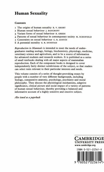 Preface; 1. The origins of human sexuality R. V. Short; 2. Human sexual behaviour J. Bancroft; 3. Variant forms of sexual behaviour R. Green; 4. Patterns of sexual behaviour in contemporary society M. Schofield; 5. Constriants on sexual behaviour C. R. Austin; 6. A perennial morality G. R. Dunstan; Index.