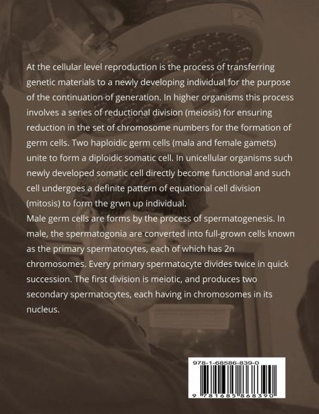 At the cellular level reproduction is the process of transferring genetic materials to a newly developing individual for the purpose of the continuation of generation. In higher organisms this process involves a series of reductional division (meiosis) for ensuring reduction in the set of chromosome numbers for the formation of germ cells. Two haploidic germ cells (mala and female gamets) unite to form a diploidic somatic cell. In unicellular organisms such newly developed somatic cell directly become functional and such cell undergoes a definite pattern of equational cell division (mitosis) to form the grwn up individual. Male germ cells are forms by the process of spermatogenesis. In male, the spermatogonia are converted into full-grown cells known as the primary spermatocytes, each of which has 2n chromosomes. Every primary spermato-cyte divides twice in quick succession. The first division is meio-tic, and produces two secondary spermatocytes, each having in chromosomes in its nucleus.