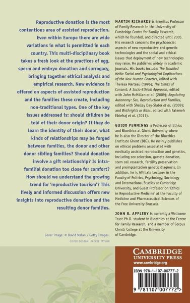 1. Introduction Martin Richards, Guido Pennings and John B. Appleby; 2. The biology of donation Martin Johnson; 3. Ethics for reproductive donation Robert Klitzman; 4. Parenthood: whose right is it anyway? Anja Karnein; 5. Reproductive donation: global perspectives and cultural diversity Zeynep B. Gürtin and Effy Vayena; 6. UK and USA perspectives on the regulation of reproductive donation Theresa Glennon; 7. Gamete and embryo donation: a legal view from Spain Yolanda Garcia-Ruiz and Diana Guerra-Diaz; 8. The legal and ethical regulation of transnational donation Guido Pennings and Zeynep B. Gürtin; 9. Balancing ethical criteria for the recruitment of gamete donors Guido Pennings, Effy Vayena and Kamal Ahuja; 10. Challenges in intra-family donation Effy Vayena and Susan Golombok; 11. ARTs and the single parent Susanna Graham and Andrea Braverman; 12. Reproductive donation and justice for gay and lesbian couples John B. Appleby, Sarah Jennings and Helen Statham; 13. Is disclosure in the best interests of the children conceived by donation? John B. Appleby, Lucy Blake and Tabitha Freeman; 14. Identifiable donors and siblings: implications for the future Tabitha Freeman, John B. Appleby and Vasanti Jadva; 15. Ethical issues in embryo donation Fiona MacCallum and Heather Widdows; 16. Reproduction through surrogacy: the UK and USA experience Andrea Braverman, Polly Casey and Vasanti Jadva; 17. Some conclusions regarding the interaction of normative and descriptive elements in reproductive donation Guido Pennings.