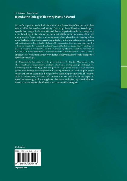 Successful reproduction is the basis not only for the stability of the species in their natural habitat but also for productivity of our crop plants. Therefore, knowledge on reproductive ecology of wild and cultivated plants is important for effective management of our dwindling biodiversity and for the sustainability and improvement of the yield in crop species. Conservation and management of our plant diversity is going to be a major challenge in the coming decades, particularly in the tropical countries which are rich in biodiversity. Reproductive failure is the main driver for pushing a large number of tropical species to vulnerable category. Available data on reproductive ecology on tropical species is very limited and there is an urgent need to initiate research on these lines. A major limitation for the beginners to take up research is the absence of simple concise work manuals that provide step-wise procedures to study all aspects of reproductive ecology.
