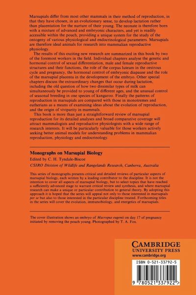 Marsupials differ from most other mammals in their method of reproduction, in that they have chosen, in an evolutionary sense, to develop lactation rather than placentation for the nurture of their young. The neonate is therefore born with a mixture of advanced and embryonic characters, and yet is readily accessible within the pouch, providing a unique system for the study of the ontogeny of various physiological and endocrinological parameters. Marsupials are therefore ideal animals for research into mammalian reproductive physiology. The results of this exciting new research are summarized in this book by two of the foremost workers in the field. Individual chapters analyse the genetic and hormonal control of sexual differentiation, male and female reproductive structures and their functions, the role of the corpus luteum in the oestrous cycle and pregnancy, the hormonal control of embryonic diapause and the role of the marsupial placenta in the development of the embryo. This book is more than just a straightforward review of marsupial reproduction for its detailed analyses and broad comparative coverage will attract mammalogists and reproductive physiologists with a wide range of research interests.