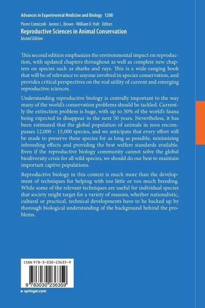 Foreword: Tom Lovejoy.- Introduction: Reproductive Science as an Essential Component of Conservation Biology.- Section I: Survival and Adaptation of Species in a Changing Environment.- The Importance of Reproduction for the Conservation of Slow-Growing Animal Populations.- Reproductive Impact of Environmental Chemicals on Animals.- The Transgenerational Impact of Environmental Change.- Stress, Well-Being and Reproductive Success.- Physiological Thresholds in the Context of Marine Mammal Conservation.- The Role of Reproductive Sciences in the Preservation and Breeding of Commercial and Threatened Teleost Fishes.- Reproductive Microbiomes in Wild Animal Species - A New Dimension in Conservation Biology.- Section II: Progress in Understanding, Assisting, or Suppressing Reproduction in Wild Species.- Update on Comparative Reproductive Biology of Elephants: Factors Affecting Reproduction, Health, and Welfare.- Comprehensive Breeding Techniques for the Giant Panda.- Marsupials: Progress and Prospects.- Using the Koala (Phascolarctos cinereus) as a Case Study to Illustrate the Development of Artificial Breeding Technology in Marsupials: An Update.- Reproductive Science Methods for Wild, Fully-Marine Mammals: Current Approaches and Future Applications.- Amphibian Assisted Reproductive Technologies: Moving from Technology to Application.- Reproductive Science in Sharks and Rays.- Cryopreservation as a Tool for Reef Restoration: 2019.- Fertility Control in Wildlife: Review of Current Status, Including Novel and Future Technologies.- From the Ivory Tower to Reality: Conclusions of the New Edition.-