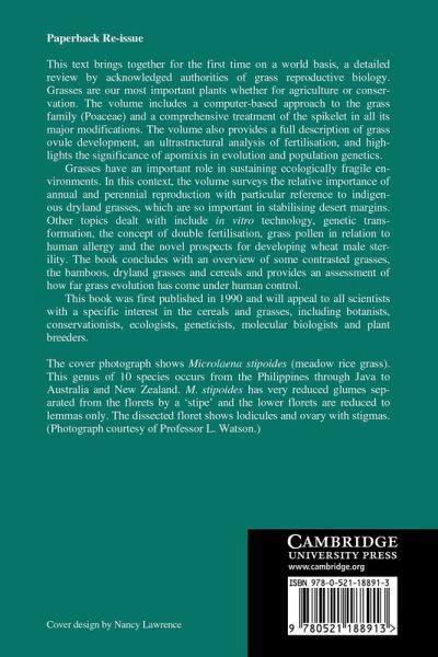 Originally published in 1990, this text brings together a detailed review by acknowledged authorities of grass reproductive biology. Grasses are our most important plants whether for agriculture or conservation. Essential to contemporary awareness of grasses is an understanding of their role in sustaining ecologically fragile environments, and the relative importance of annual and perennial reproduction is examined here with particular reference to indigenous dryland grasses marginal to major deserts. Molecular biology and tissue culture allow us to intervene in reproductive systems and the issues include a fundamental revision of the concept of double fertilisation grass pollen in relation to human allergy and the prospects for developing wheat male sterility. The book concludes with an overview to assess how far evolution of the grass is coming under human control.