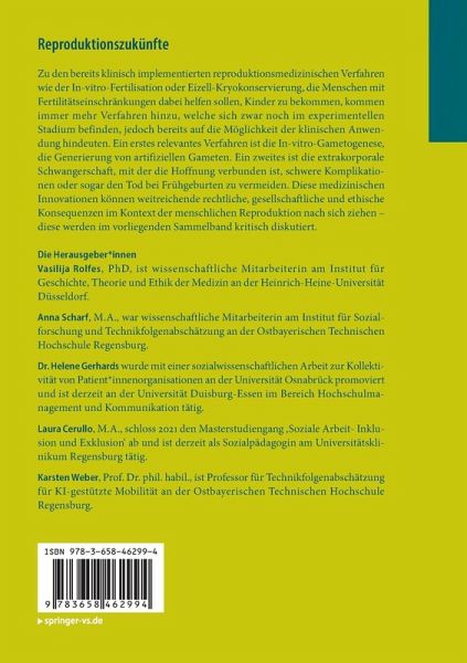 Vasilija Rolfes, PhD ist wissenschaftliche Mitarbeiterin am Institut für Geschichte, Theorie und Ethik der Medizin an der Heinrich-Heine-Universität Düsseldorf. Anna Scharf, M.A., ist wissenschaftliche Mitarbeiterin am Institut für Sozialforschung und Technikfolgenabschätzung an der Ostbayerischen Technischen Hochschule Regensburg. Dr. Helene Gerhards wurde mit einer sozialwissenschaftlichen Arbeit zur Kollektivität von Patient*innenorganisationen an der Universität Osnabrück promoviert und ist derzeit an der Universität Duisburg-Essen im Bereich Hochschulmanagement und Kommunikation tätig. Laura Cerullo, M.A., war als wissenschaftliche Mitarbeiten im Projekt 'In-vitro-Gametogenese(IVG) und artifizieller Uterus(AU) - Problemauslöser oder Problemlöser?' tätig. Sie absolvierte im Jahr 2021 den Masterstudiengang Soziale Arbeit - Inklusion und Exklusion an der Ostbayerischen Technischen Hochschule Regensburg (OTH). Zwischen 2019 und 2022 war sie als wissenschaftliche Mitarbeiterin Teil verschiedener Projekte im Themenfeld 'altersgerechter Assistenzsysteme' am Institut für Sozialforschung und Technikfolgenabschätzung der OTH Regensburg. Karsten Weber, Prof. Dr. phil. habil., ist Professor für Technikfolgenabschätzung für KI-gestützte Mobilität an der Ostbayerischen Technischen Hochschule Regensburg.