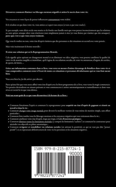 Découvrez comment éliminer vos blocages mentaux négatifs et attirer le succès dans votre vie. Vos croyances et votre façon de penser influencent constamment votre réalité. Et le résultat est que dans votre vie, vous attirez ce à quoi vous croyez (et non ce que vous voulez). Si, par exemple, votre désir est de vous marier et de fonder une famille mais que vous pensez inconsciemment que les relations ne sont qu'une arnaque alors vous n'arriverez tout simplement jamais à rien (et vous finirez par n'attirer que des arnaques), parce que c'est ce que vous croyez vraiment. Que vous le vouliez ou non, votre état d'esprit n'attirera que des personnes et des situations en accord avec votre pensée. Mais voici maintenant la bonne nouvelle : Il existe une solution qui est la Reprogrammation Mentale. Cela signifie qu'en opérant un changement mental et en éliminant vos idées négatives, vous pourrez améliorer la qualité de votre vie de manière tangible et immédiate ; qu'il s'agisse de vos relations sociales, de votre vie amoureuse, d'argent, de carrière, de sports, de loisirs, ... Grâce aux informations contenues dans ce livre, vous serez en mesure d'attirer davantage de bénéfices dans votre vie et vous comprendrez comment rester à l'écart de toutes ces situations et personnes dévalorisantes qui ne vous font aucun bien. Vous avez bien lu, j'ai dit attirer, pas obtenir. Parce qu'une fois que vous aurez affiné votre état d'esprit avec les bons programmes de ce livre, vous verrez la magie commencer. Vos pensées deviendront un aimant puissant et vous commencerez à attirer automatiquement et naturellement ce dont vous rêvez et à avoir la vie que vous désirez. Voici un avant-goût de ce que vous découvrirez à la lecture de ce livre : Comment fonctionne l'esprit et comment le reprogrammer pour acquérir un état d'esprit de gagnant et réussir au travail et dans la vie ; Comment changer votre image mentale pour devenir la meilleure version de vous-même de manière simple, sans effort particulier ; Comment faire tomber tous les blocages mentaux et les croyances négatives qui vous retiennent dans la vie ; Comment améliorer votre état d'esprit, étape par étape, à l'aide d'exercices pratiques ; Comment éliminer toutes les limitations mentales (y compris les limitations "cachées") et comment les contourner pour atteindre vos objectifs en pilote automatique ; Comment revigorer et rentabiliser vos relations sociales (en attirant la positivité, ce qui ne veut pas dire "penser positif") et en repoussant définitivement de votre vie les personnes et les situations négatives. Il est inutile de lire des livres de motivation, de s'efforcer d'être toujours positif ou de s'imaginer heureux. Rien ne peut être changé si vous n'agissez pas directement sur vos croyances, si vous n'agissez pas sur votre subconscient. Procurez-vous dès maintenant ce guide et laissez-le reprogrammer votre esprit en mode automatique.