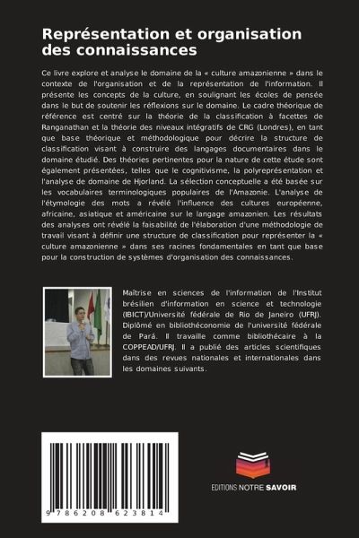 Ce livre explore et analyse le domaine de la « culture amazonienne » dans le contexte de l'organisation et de la représentation de l'information. Il présente les concepts de la culture, en soulignant les écoles de pensée dans le but de soutenir les réflexions sur le domaine. Le cadre théorique de référence est centré sur la théorie de la classification à facettes de Ranganathan et la théorie des niveaux intégratifs de CRG (Londres), en tant que base théorique et méthodologique pour décrire la structure de classification visant à construire des langages documentaires dans le domaine étudié. Des théories pertinentes pour la nature de cette étude sont également présentées, telles que le cognitivisme, la polyreprésentation et l'analyse de domaine de Hjorland. La sélection conceptuelle a été basée sur les vocabulaires terminologiques populaires de l'Amazonie. L'analyse de l'étymologie des mots a révélé l'influence des cultures européenne, africaine, asiatique et américaine sur le langage amazonien. Les résultats des analyses ont révélé la faisabilité de l'élaboration d'une méthodologie de travail visant à définir une structure de classification pour représenter la « culture amazonienne » dans ses racines fondamentales en tant que base pour la construction de systèmes d'organisation des connaissances.