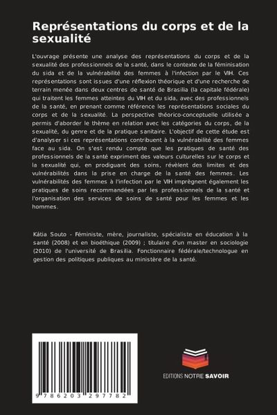 L'ouvrage présente une analyse des représentations du corps et de la sexualité des professionnels de la santé, dans le contexte de la féminisation du sida et de la vulnérabilité des femmes à l'infection par le VIH. Ces représentations sont issues d'une réflexion théorique et d'une recherche de terrain menée dans deux centres de santé de Brasilia (la capitale fédérale) qui traitent les femmes atteintes du VIH et du sida, avec des professionnels de la santé, en prenant comme référence les représentations sociales du corps et de la sexualité. La perspective théorico-conceptuelle utilisée a permis d'aborder le thème en relation avec les catégories du corps, de la sexualité, du genre et de la pratique sanitaire. L'objectif de cette étude est d'analyser si ces représentations contribuent à la vulnérabilité des femmes face au sida. On s'est rendu compte que les pratiques de santé des professionnels de la santé expriment des valeurs culturelles sur le corps et la sexualité qui, en prodiguant des soins, révèlent des limites et des vulnérabilités dans la prise en charge de la santé des femmes. Les vulnérabilités des femmes à l'infection par le VIH imprègnent également les pratiques de soins recommandées par les professionnels de la santé et l'organisation des services de soins de santé pour les femmes et les hommes.