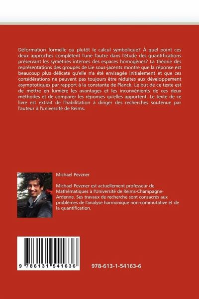Déformation formelle ou plutôt le calcul symbolique? À quel point ces deux approches complètent l'une l'autre dans l'étude des quantifications préservant les symétries internes des espaces homogènes? La théorie des représentations des groupes de Lie sous-jacents montre que la réponse est beaucoup plus délicate qu'elle n'a été envisagée initialement et que ces considérations ne peuvent pas toujours être réduites aux développement asymptotiques par rapport à la constante de Planck. Le but de ce texte est de mettre en lumière les avantages et les inconvénients de ces deux méthodes et de comparer les réponses qu'elles apportent. Le texte de ce livre est extrait de l'habilitation à diriger des recherches soutenue par l'auteur à l'université de Reims.