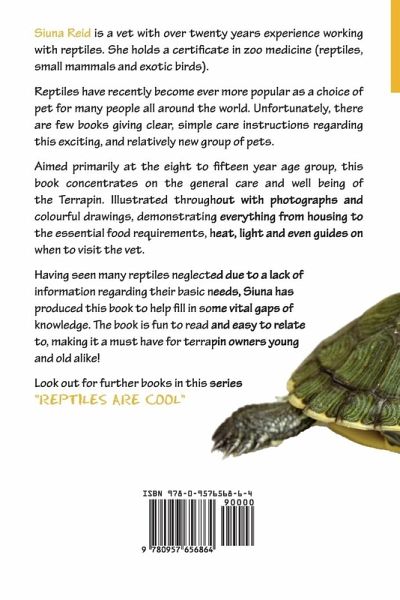 Siuna Reid is a vet with over twenty years experience working with reptiles. She holds a certi¬ficate in zoo medicine (reptiles, small mammals and exotic birds). Reptiles have recently become ever more popular as a choice of pet for many people all around the world. Unfortunately, there are few books giving clear, simple care instructions regarding this exciting, and relatively new group of pets. Aimed primarily at the eight to ¬ fifteen year age group, this book concentrates on the general care and well being of the Terrapin. Illustrated throughout with photographs and colourful drawings, demonstrating everything from housing to the essential food requirements, heat, light and even guides on when to visit the vet. Having seen many reptiles neglected due to a lack of information regarding their basic needs, Siuna has produced this book to help ¬ ll in some vital gaps of knowledge. The book is fun to read and easy to relate to, making it a must have for terrapin owners young and old alike! Look out for further books in this series REPTILES ARE COOL!