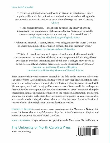 Based on more than twenty years of research in the field and in museum collections, Reptiles of North Carolina is the definitive work on the 71 reptile species found in the state. It is an indispensable resource for herpetologists, zoologists, ecologists, and wildlife managers, and it will be enjoyed by amateur naturalists as well. For each species the authors offer a description that includes characteristics useful in distinguishing the species from similar ones and information on the variation, distribution, and natural history of the species in the state. Each account is accompanied by a range map and at least one detailed drawing that shows characteristics important for identification. A section of color photographs aids in identification of reptiles.