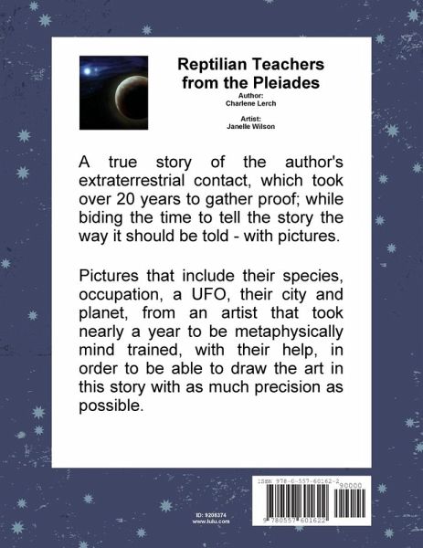Can you look at being's face that doesn't look anything like you and say you don't judge its looks? I did ... and it started the beginning of where this book will lead you. This is a fantastic and beautiful full color book of art and pictures, along with a true story of the author's contact with some unusual metaphysical teachers. Teachers that were from another area of the universe that taught her what she teaches people today. The art was drawn by a talented self-taught artist who had to take nearly a year to be trained, along with their help, to do remote viewing, among other things, in order to be able to draw the art in this story with as much precision as possible. The art shows their species, their occupations, a UFO along with their city and planet - making this true story come alive because of it. The cover is only the beginning of what you'll discover inside.